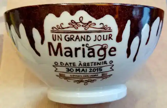 Cadeau de mariage bol en porcelaine personnalisé d'après le faire-part de mariage.